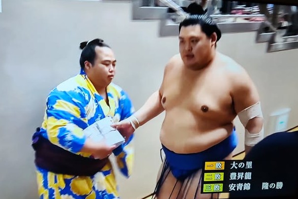 Украины сүмоч Комүсүби Аонишики энэ өдөр Таканошо /М-7/-той учраа таарч хүчээ сорин түүнийг ваташикоми мэхээр хаяснаар тэд адилхан 10 даваа, 3 унаатай башёг үргэлжлүүлж байна.