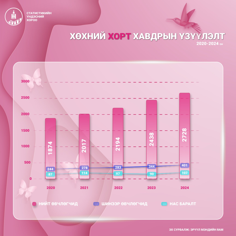 Улаанбаатар, 2025 оны аравдугаар сарын 10 /МОНЦАМЭ/. Улсын хэмжээнд өнгөрсөн онд хөхний хорт хавдраар 2728 хүн өвдсөнөөс 401-ийг нь шинээр оношилсон байна.
