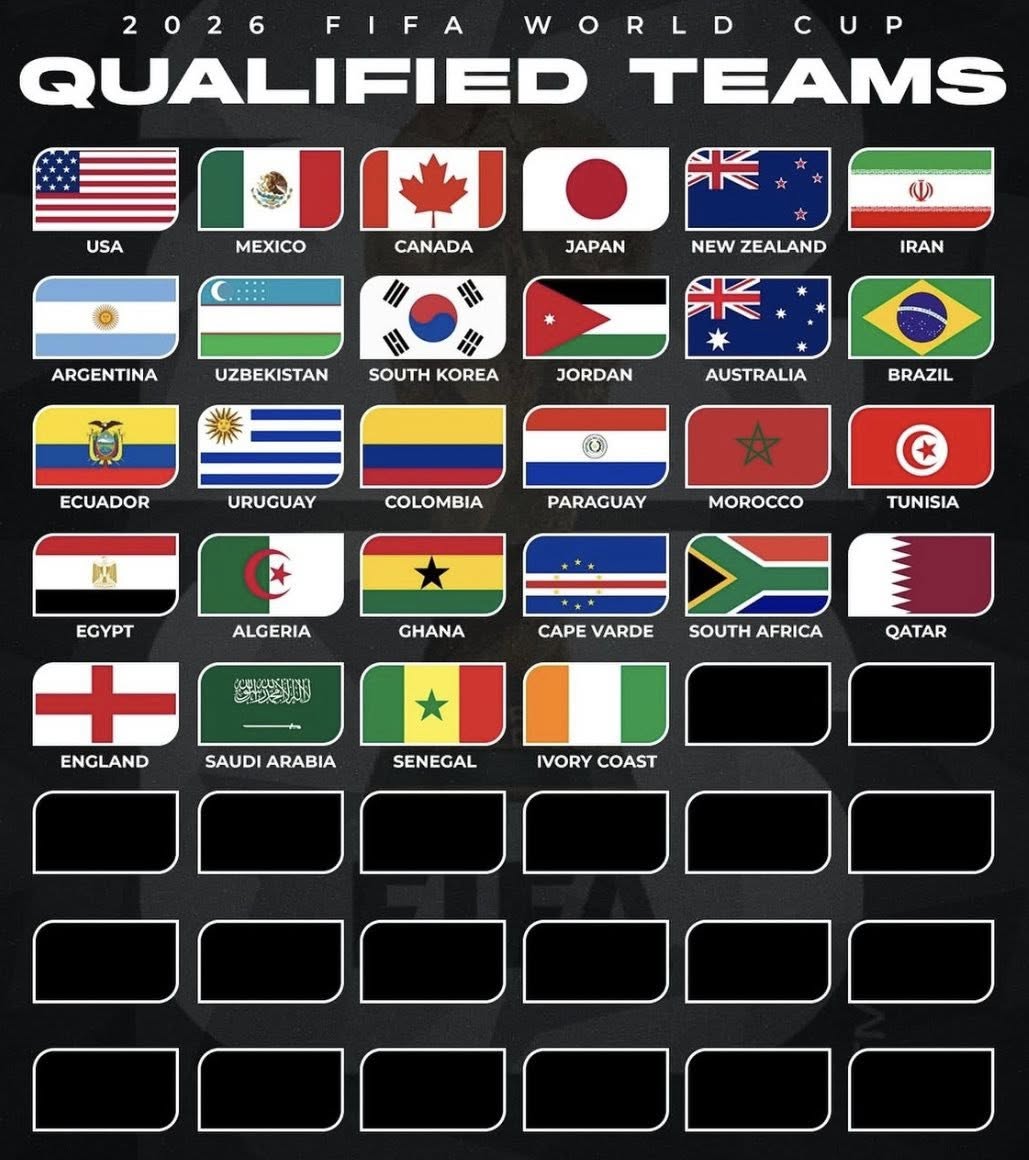 Ийнхүү 2026 оны ДАШТ-ий 48 "суудлаас" 28 нь эзэнтэй болсон. Үлдсэн 20 "тасалбар"-ын 15 нь Европын багт, гурав Хойд Америкийн багт, хоёр нь тив хоорондын плэй-оффоос шалгарсан багт оногдоно.