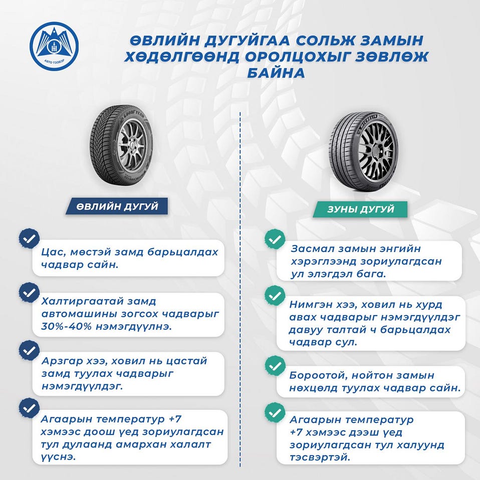 Манай улсад бусад орнуудыг бодвол харьцангуй их цас ордог, хүйтэн байдаг. Иймээс бидэнд автомашины зуны дугуйг өвлийн дугуйгаар солих шаардлага зайлшгүй гардаг.