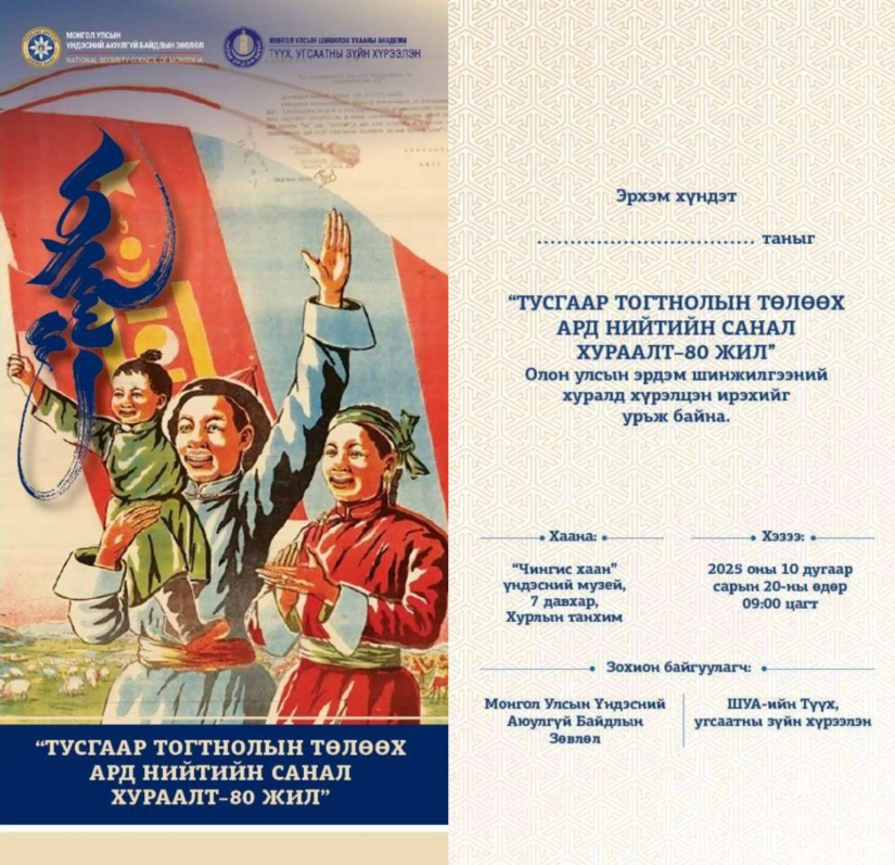 Монгол Улсын Үндэсний Аюулгүй Байдлын Зөвлөл, ШУА-ийн Түүх, угсаатны зүйн хүрээлэн хамтран “Тусгаар тогтнолын төлөө ард нийтийн санал хураалт-80 жил” сэдэвт олон улсын эрдэм шинжилгээний хурлыг “Чингис хаан” үндэсний музейд зохион байгуулна.