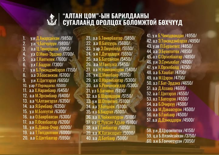Монголын Үндэсний бөхийн холбооны “Алтан цом 2025” барилдаанд Үндэсний шилдэг 8 компанийн баг өрсөлдөнө. Баг тус бүр 8 гишүүнтэй байх бөгөөд 3 гишүүнийг сонгож, үлдсэн 5 бөхийг сугалаагаар тодруулах юм.