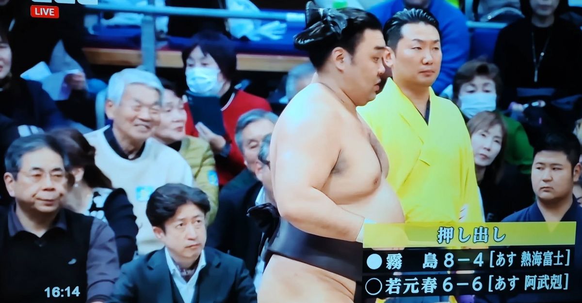 Киришима Б.Лхагвасүрэн/М-2/ Вакамотохару /М-2/-тай таарч барилдан түүнийг ошидаши мэхээр хаяснаар 8 даваа, 4 унаатай башёг үргэлжлүүлж байна.