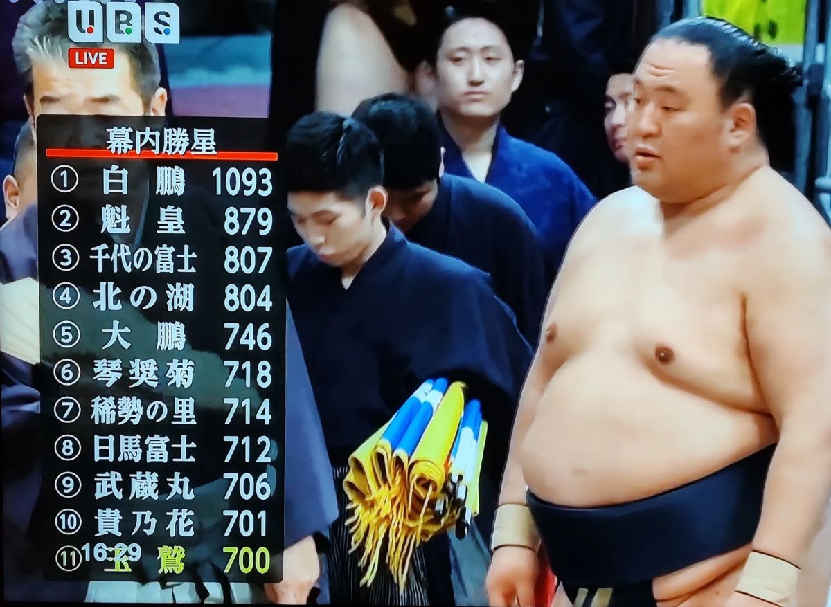 Энэ башёд Макүүчид дэвшин барилдаж байгаа Чиёошома Г.Мөнхсайхан /М-17/ өнөөдөр Гонояама /М-13/-тай учраа тааран барилдаж түүнийг уватэнаге мэхээр хаяснаар 8 даваа, 4 унаатай боллоо.