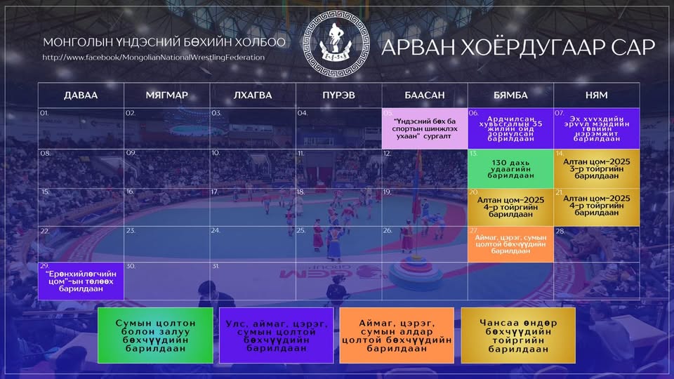 МҮБХ-ноос 12 дугаар сард зохион байгуулах албан ёсны барилдаан, үйл ажиллагааны хуваарийг та бүхэнд танилцуулж байна.