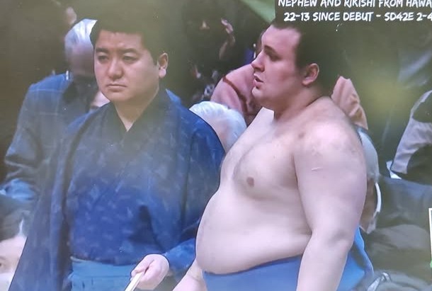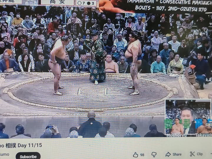 Хамгийн ахмад сумоч Тамаваши Б.Мөнх-Оргил/М-5/ энэ өдөр Кинбозан/М-8/-тай учраа тааран хүч үзэн түүнд ёрикири мэхээр унаснаар тэд адилхан 4 даваа, 7 унаатай башёг үргэлжлүүлж явна.