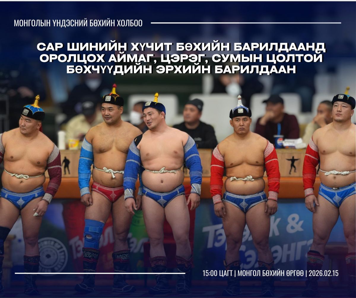 Арван долдугаар жарны “Сүрээр дарагч” хэмээх гал морин жилийн сар шинийн баярт зориулсан Улс, аймаг, цэрэг, сумын цолтой хүчит 256 бөхийн барилдаан 2026 оны 2 дугаар сарын 16, 17-ны өдрүүдэд 13.00 цагт Монгол бөхийн өргөөнд зохион байгуулагдана.