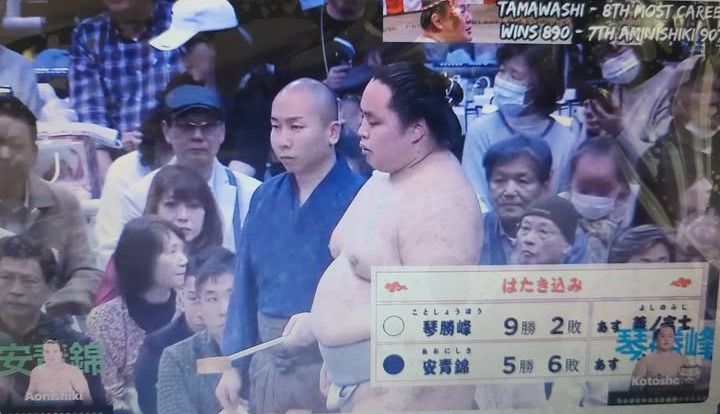 Озэки Аонишики башёгийн 10 дахь өдөр Котошохо/М-5/ учраа тааран хүч үзэж түүнд хатакикоми мэхээр унаж 5 даваа, 6 унаатай боллоо. Харин Котошохо 9 даваа, 2 унаатай болоод байна.
